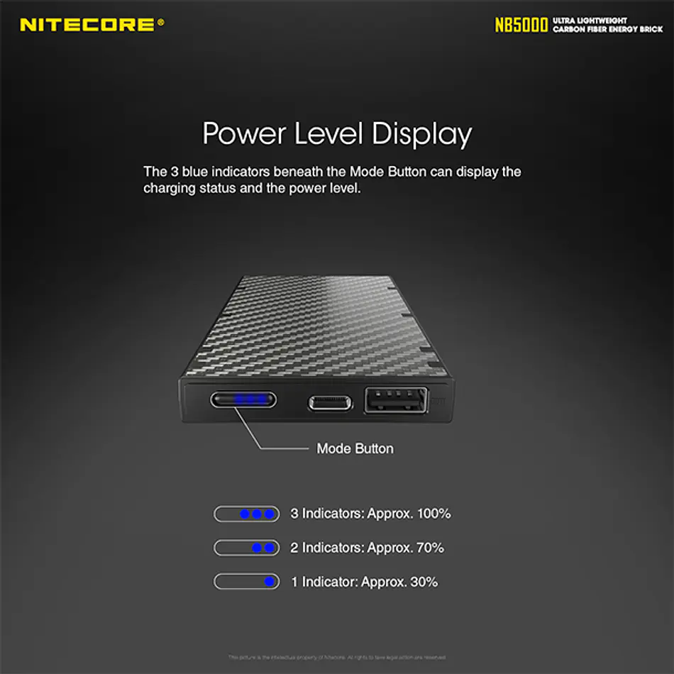 La Batería Externa Nitecore serie NB está hecha de carbono, siendo la más liviana del mercado. Es resistente a la abrasión y los golpes, tiene un índice contra el agua de IPX5. Es tu compañera perfecta para tus aventuras en la ciudad y al aire libre.